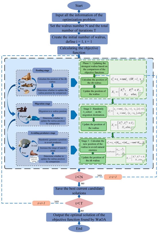 After the first iteration of the WaOA, the walrus position is updated and the value of the objective function is calculated following a three-stage strategy. Then, iterative optimization following the steps of the WaOA is performed until the number of iterations is appropriate. Finally, the WaOA outputs the optimal candidate solution as the final solution. The flowchart illustrating the execution of the WaOA is presented in Figure 1.