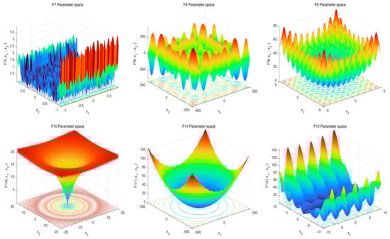 In the process of developing and improving optimization algorithms, benchmark function testing is highly valued []. Twelve benchmark functions are selected for the simulation test, as shown in Table 1. The definition domain limits the search space, and the theoretical values reflect the optimal solutions. F1–F6 are unimodal functions that possess only one global optimal solution, without a local optimum. They are utilized to test the convergence speed and development behavior of the algorithm. F7–F12 are multimodal functions, which possess global optimum as well as several local optimal solutions. The number grows exponentially as the dimension increases, which can be utilized to examine the capability of the algorithm to break away from local optimal and global search capability [,]. One of the advantages of the multimodal function is that it has high similarity with the search space of practical problems []. Figure 2 displays the diagram of the search space of the WaOA in benchmark functions F7–F12.