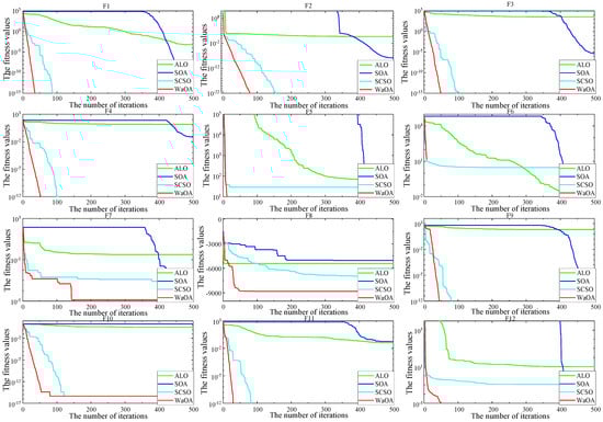 However, relying on the data in Table 3 solely is not sufficient to fully evaluate the optimization effect of the WaOA on the benchmark function. In order to further understand its performance, the convergence curves on different functions for the WaOA and other algorithms are plotted, as shown in Figure 3.