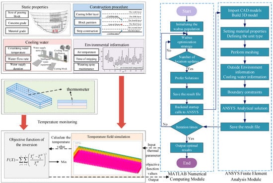 Parameter inverse analysis is a problem that requires searching through a large space of multiparameter combinations. Usually, the problem of parameter inversion analysis is converted into an optimization issue. The objective function is minimized by multiple iterations []. However, some traditional optimization methods often have problems such as locally optimal solution, being time-consuming, and having low accuracy for complex numerical models []. Therefore, searching for efficient optimization algorithms has become a popular topic. In recent years, the inversion of thermal parameters for dams has captured the interest of numerous scholars and has been thoroughly investigated. Pei et al. [] utilized an enhanced genetic algorithm to conduct the inversion of the thermal parameters of concrete arch dams. Han et al. [] set up a thermal model for concrete by taking the degree of hydration into account, and inversed the specific heat and thermal conductivity of fly-ash concrete by BP neural network. Zhao et al. [] developed an inversion program relying on the particle swarm optimization algorithm (PSO) to invert the thermal resistance parameters of early cement paste. Shi et al. [] used a genetic algorithm to inverse the thermal parameters, and used the inversed parameters to predict the temperature change of concrete within 300 days. According to the temperature data that were monitored by the DTS system, Su et al. [] inverted the thermal diffusion coefficient and surface heat transfer coefficient of concrete, and inserted the results into the finite element model to conduct the calculation. It turned out that the simulation outcomes were highly consistent with the calculation results.