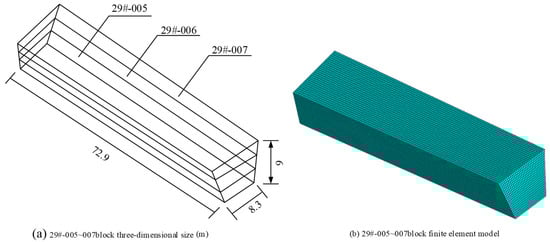 Figure 5 shows the information of the 29#-005~007 concrete pouring block of an arch dam in the downstream section of Jinsha River. It can be seen that the thickness of each pouring block amounts to three meters, and it consists of six blank layers that is half a meter thick. The concrete strength grade is C40. The finite element model is discretized using hexahedral eight-node isoparametric elements. There are 37,800 elements and 42,718 nodes built in total. According to the design value of concrete in this area and the laboratory test value provided by Changjiang River Scientific Research Institute [], the range of inversion parameters is as follows: , , .