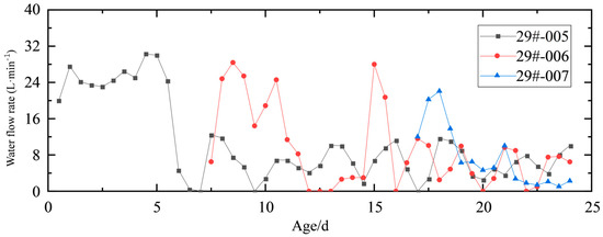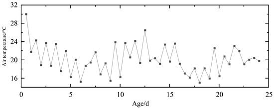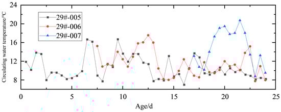 The time step of temperature calculation is set at 0.5 d, and the overall time spans 30 d. The actual interval time among different blocks is decided in line with the pouring progress. The time, circulating water temperature, and water flow rate data of cooling water gained are in accordance with the intelligent water-cooling system of this dam, as depicted in Figure 6 and Figure 7. The average temperature of every 0.5 d is designated as the ambient temperature, as depicted in Figure 8.