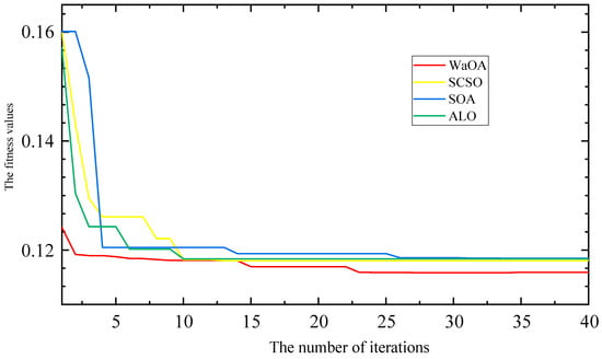 For a thorough assessment of the performance of the WaOA in practical applications, the four algorithms described in Chapter 2 are included in the parameter inversion calculation. Taking the time factor into account, the population is set at thirty, and the iteration number amounts to forty. Figure 9 illustrates the change of the fitness value of different algorithms in relation to the number of iterations.