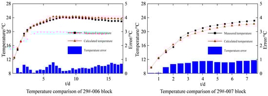 With reference to the thermal parameters that were acquired through inversion in Table 6, the numerical simulation of temperature field is carried out for the 29#-006~007 pouring block. Figure 10 presents the comparison of the measured temperature and the calculated temperature data throughout the time.