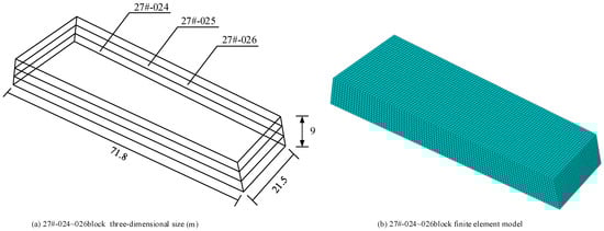 Figure 11 shows the information on pouring bay 27#-024 to 026. The grid cell of the finite element model is an eight-node hexahedral isoparametric cell, which is made up of 32,400 elements and 36,673 nodes in total.