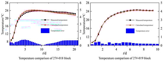 Using the field-measured water information and ambient temperature data, the thermal parameters of C40 concrete in the 29#-005~007 block obtained by inversion in Table 6 are applied to the finite element numerical simulation model of the 27#-024~026 block. Through the calculation, the calculated temperature values of the 27#-025 and the 026 blocks are obtained, and compared with the measured temperature onsite. The results of the comparison are demonstrated in Figure 12.