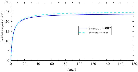 According to the research report of the Changjiang River Scientific Research Institute on the concrete mix proportion test of the dam of the hydropower station [], the thermal parameters of the C40 strength grade concrete obtained through inversion are compared with the values from laboratory tests, as demonstrated in Table 9. Figure 13 shows the comparison of the curve of the adiabatic temperature rise of concrete as its age changes.