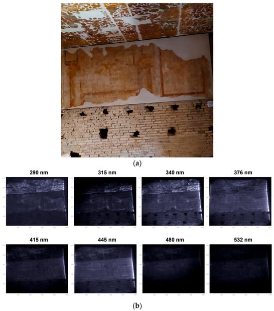 (a) a picture of the west wall compared to (b) the raw fluorescence images collected at the eight wavelengths selected.