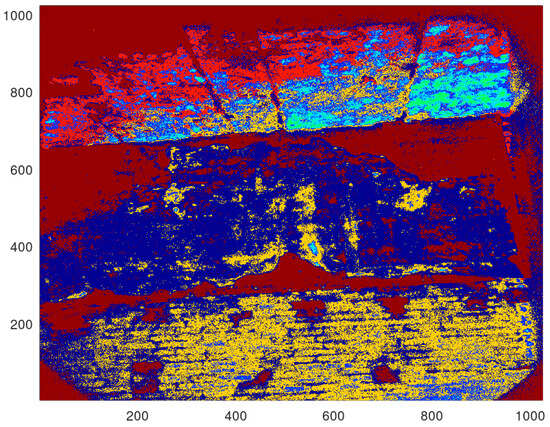 Although the 8 fluorescence images collected by the LIF sensor from the walls and ceiling are not easy to read individually (Figure 4), their reprocessing allows us to highlight only the areas characterised by the presence of specific materials. In the first stage, an already developed and tested processing method based on K-means has been used to individuate different polymers and distinguish between them. With reference to [30], the ratios I376/I445, I340/I445, and I315/I445 have been used as variables in the K-means algorithm to gather the data in 7 clusters. In the present case, the normalisation has been set at I445 instead of I500, since the filter at 500 nm was not available. The results evidence the ability of the method to individuate different classes of materials on the studied surface (Figure 5). At first, it is possible to notice the ability to correctly individuate the areas without any analytical value (brown areas) and the ones related to non-treated plaster (in dark blue). The yellow, blue, and cyan areas refer to the presence of consolidant and protective agents, constituted mainly by synthetic polymers. Red pixels probably refer to the honeycomb panels, although the proximity of these areas to the upper physical border of the optical filters makes their evaluation not completely reliable.