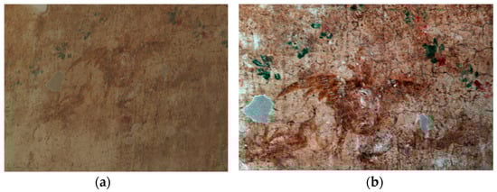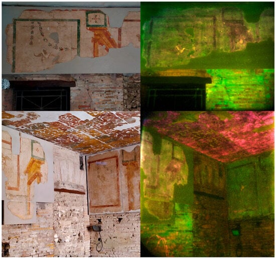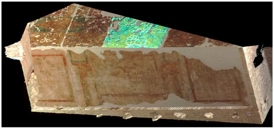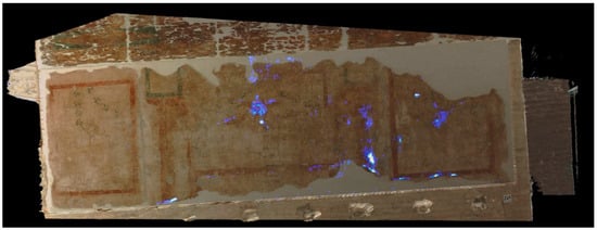 Subsequently, an attempt was made to highlight only acrylic consolidant materials. Based on the data previously collected from reference samples, the ratio 340/290 was selected for this purpose. Furthermore, the complementarity with the RGB-ITR technique allows these areas to be integrated into a 3D model as an additional layer. Figure 6 and Figure 7 present examples of the west wall and the ceiling. A short movie with LIF results as an additional texture of the 3D model produced by the RGB-ITR system is presented as Supplementary Materials attached to the present paper.