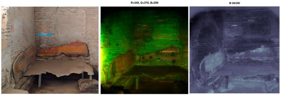 As for Room A, the LIF data processing highlights different characteristics regarding both the masonry and the fresco decorations. As regards the masonry, it makes the areas subjected to reconstruction, already in ancient times, clearly visible. The boundaries of the reconstructed area are identified, although probably made with reused original bricks (Figure 11 left). The reconstructed area on the north wall would seem to correspond to that of a bricked-up door at the time of the architectural and functional transformation of the building (4th century). The rest of the wall (darker area) must be recognised as a “mimetic” restoration carried out between the 1930s and 1940s. This is part of the restoration works carried out on a large scale in Ostia in that period with additions done using the same building materials used in Roman times and found in large quantities in the collapses. In many cases, therefore, the portions of restored masonry are completely indistinguishable from the original ones, unless they turn into expensive and invasive operations such as the sampling and chemical-physical analysis of the mortars. For this reason, the LIF results, which demonstrate its ability to distinguish between the original masonry and the restored one, are all the more interesting.