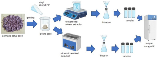 The ground seeds of each variety were mixed with a 70% alcohol solution to prepare the sample for extraction. Subsequently, the mixture was subjected to two distinct extraction techniques: the traditional conventional extraction method (CES) and an alternative approach utilizing ultrasound-assisted extraction (UAE) (Figure 1).