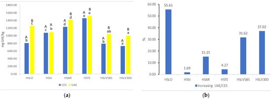 Comparative TPC content following CES and UAE: (a) TPC values using CES and UAE methods. (b) Increasing TPC using UAE/CES methods. Distinct lower-case letters (a–e) signify significant differences (p < 0.05) among samples derived from the same extraction procedure. Distinct capital letters (A, B) denote significant differences (p < 0.05) between samples derived from various extraction procedures.