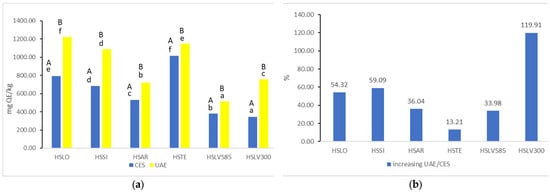 A notable increase in TPC was observed following UAE compared with CES (Figure 2b). The maximum increase was for the HSLO extract (55.61%), while the minimum was for the HSSI extract (1.69%).