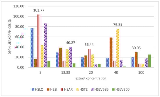 Regarding the influence of the extraction technique, Figure 4 shows that ultrasound-assisted extraction (DPPH—UAE) led to increases in DPPH values ranging from 1.72% to 103.77% compared with the values obtained using the conventional extraction method (DPPH—CES).
