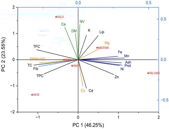 Analysis of the biplot revealed that the HSTE variety was characterized by high values of antioxidant activity (DPPH100) and TC, and HSLV by a high content of ash, protein, Zn, Fe, Mn, and Ni, while HSLO had a high content of Ca and DM.