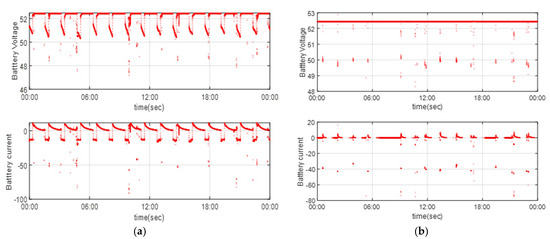 Figure 7 illustrates how the charge–discharge current and voltage profiles of a satellite battery vary over time and across seasons. A comparison between data from 1 December 2017 and 1 July 2017 reveals significant differences in the battery’s charge–discharge patterns. In the December data, charge–discharge cycles occurred more frequently, with greater variations in the maximum and minimum current values. In addition, the voltage drops during discharge cycles were more pronounced. By contrast, the July data show less frequent charge–discharge cycles, smaller fluctuations in current, and a relatively stable battery voltage.