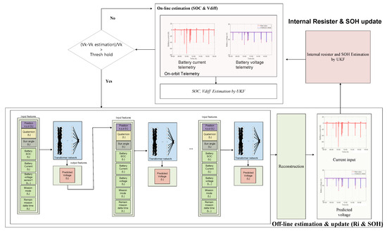 Therefore, in this study, we propose a novel technique for estimating the charge and discharge states of LEO satellite batteries online based on using the unscented Kalman filter (UKF) algorithm and for diagnosing battery aging offline based on using a data-driven transformer network-based voltage prediction model. By integrating advanced machine learning techniques with domain knowledge specific to satellite systems, the proposed algorithm is designed to enhance the accuracy of battery aging predictions while minimizing the need for extensive manual intervention by users.