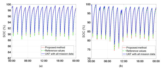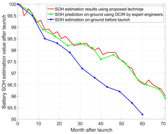 Figure 13 illustrates the results of SOC estimation obtained using the proposed aging estimation approach, the results of SOC estimation obtained using the aging estimation with various mission condition data with the UKF, and SOC estimation with aging estimation analyzed by a satellite expert at the ground station. Herein, the comparison is between the results for (a) the early phase of satellite operation and (b) 51 months after launch.