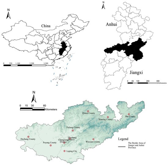 Location map and research scope of the border area between Jiangxi and Anhui Provinces, Source: Drawn by authors based on the satellite base map of Map World GS (2024) No. 0650 Data Sources.
