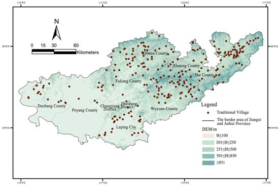 The research data primarily originates from three sources: (1) Geographic Information Systems. Traditional villages were represented as “points” on the geospatial data on the macro spatial scale, and the geographic coordinates of the traditional villages were extracted using Google Earth and imported into ArcGIS 10.8 software to build a geospatial database of the traditional villages and dwellings in the Jiangxi-Anhui junction area. The basic geographic information data mainly comes from the geospatial data cloud. (https://www.gscloud.cn, accessed on 1 December 2024). (2) Literature and Historical Materials. Literature and historical data were collected from multiple sources: the Digital Museum of Traditional Villages in China (https://www.dmctv.cn, accessed on 1 December 2024), county records, gazetteers, and ethnographies of Xin’an and Xiuning, as well as research findings pertaining to traditional villages and dwellings in the Jiangxi-Anhui junction area. Dialect data were extracted from the Chinese dialect map of the southeastern region found in the 1987 Atlas of Chinese Language. (3) Field Research. Attribute information, including village names, spatial configurations, street layouts, and dwelling types, was gathered through interviews, aerial photography, conventional photography, and mapping techniques.