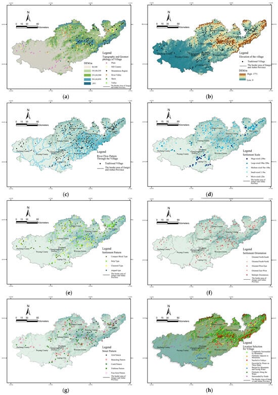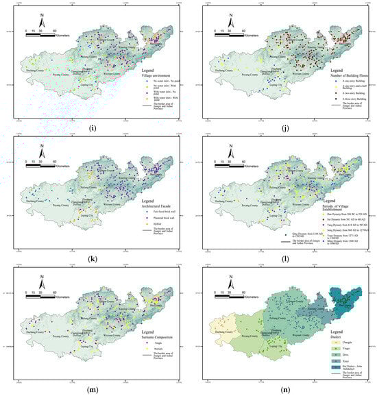 Spatial distribution characteristics of data-based cultural landscape factor types in traditional villages at the Jiangxi-Anhui border region: (a) topography and geomorphology, (b) elevation, (c) river flow pattern through the villages, (d) settlement size, (e) settlements pattern, (f) orientation of the settlements, (g) street pattern, (h) location selection for villages, (i) villages environment, (j) stories of dwellings, (k) appearance of dwellings, (l) periods of villages establishment, (m) clan structure of villages, (n) dialect. Source: Drawn by authors based on the satellite base map of Map World GS (2024) No. 0650 Data Sources.