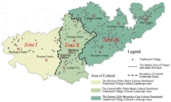 The counties of She, Xiuining, Qimen, and Wuyuan in Area III have been part of Shezhou since the Tang Dynasty, with She County serving as the state capital during the Song Dynasty. This shared governance over an extended period resulted in similarities in cultural heritage and landscape development. Wuyuan County has been under the jurisdiction of Anhui Province since its establishment in the Tang Dynasty, undergoing several administrative changes: in 1934, it was incorporated into the fifth administrative district of Jiangxi Province; in 1947, it was reverted to the seventh administrative district of Anhui Province; and on May 1, 1949, it was ultimately transferred from Anhui Province back to Jiangxi Province [52]. Although it currently falls under Jiangxi Province, Wuyuan has been profoundly influenced by Hui culture since ancient times; the landscape patterns of these villages and the architectural styles of the homes reflect the characteristics of southern Anhui. Poyang County in Area I was governed by Rao Prefecture during the Tang Dynasty, while Duchang County was also under the jurisdiction of Rao Prefecture of Jiankang Army during the same period [53]. This historical context fostered frequent social, economic, and trade interactions between the two regions, resulting in strong cultural connections and a similar cultural landscape. In Zone II, Fuliang County was historically part of Poyang County of Yuzhang County, and a portion of its northern area was previously under the jurisdiction of Qimen County. Consequently, this has created a cultural transition zone influenced by both Gan-Po Culture and Hui Culture.