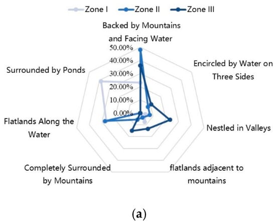 The selection of village sites, informed by empirical research findings and the geographical characteristics of mountains and water bodies, can be classified into seven distinct patterns. As depicted in Figure 6a, there are notable geographical distribution variations across the three zones. Zone I is characterized by flat terrain adjacent to Poyang Lake, reflecting the influence of long-standing fishing culture and feng shui principles. Villages here commonly favor locations surrounded by ponds or situated on lakeside flatlands, where access to water supports daily life and production while facilitating effective drainage. Zone II, situated in plains and hilly regions, predominantly features traditional villages in the plains located on lakeside flatlands, while certain areas in the hilly region of Fuliang County, previously part of Qimen County, have been shaped by the dissemination of Huizhou culture through trade and migration. As a result, site selection in this zone is often guided by Huizhou cultural feng shui concepts, leading to a preference for locations that are backed by mountains and face water. Zone III emphasizes the impact of feng shui culture on site selection, with settlements consistently choosing sites backed by mountains and facing water. Furthermore, in order to escape from the war, the immigrants from the northern central plains mostly settled in the valley crevice, surrounded by mountains on all sides.
