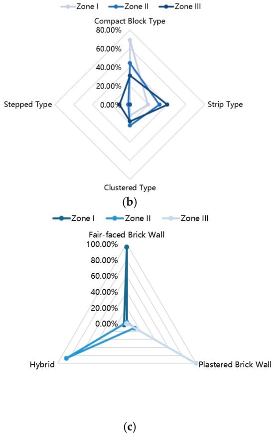 As “homologous” cultures, Gan Culture and Hui Culture exhibit certain parallels in their architectural expressions, particularly regarding compositional elements and spatial organization. However, a detailed examination reveals significant regional disparities in their architectural representations, including the appearance of traditional dwellings, entrance designs, patio configurations, eave spaces, and roof styles. Figure 3k illustrates the spatial distribution of architectural aesthetics in traditional dwelling structures within the Jiangxi-Anhui junction area. The architectural styles can be categorized into three distinct zones (Figure 6c): Zone I features clear water brick walls, indicative of advanced brick firing techniques in the region. Zone III is characterized by stuccoed brick walls, which create dwellings with an aesthetic of whitewashed surfaces and tiled roofs. Zone II serves as a transitional area between Zones I and III, where the eaves of the brick walls are ornamented, while the remainder of the wall showcases the material of the freshwater brick.