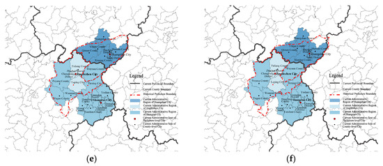 Historical administrative division in the border region of Jiangxi and Anhui Provinces. (a) Administrative divisions of Sui dynasties; (b) Administrative divisions of Tang dynasties; (c) Administrative divisions of Song dynasties; (d) Administrative divisions of Yuan dynasties; (e) Administrative divisions of Ming dynasties; (f) Administrative divisions of Qing dynasties. Source: Adapted and drawn by the author, based on “A Comprehensive History of Administrative Divisions in China” and the satellite base map from Map World GS (2024) No. 0650 Data Sources.