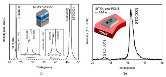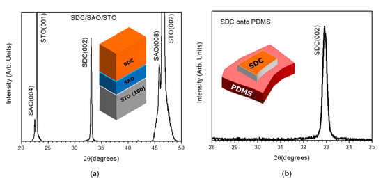 Figure 3a,b present the X-ray diffraction patterns in θ-2θ scan mode for the SDC/SAO/STO (001) heterostructure and the SDC layer transferred onto PDMS, respectively.
