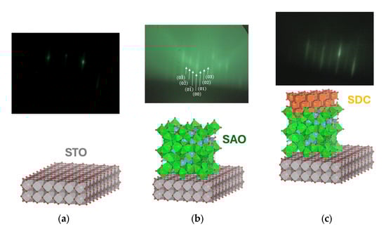 Figure 4c). The ability of the SDC layer to achieve a 2D growth mode after the initial 3D growth phase is critical for ensuring a high-quality crystalline film suitable for subsequent applications. The RHEED observations indicate the precise control over growth parameters needed to achieve high-quality surfaces and interfaces within the heterostructure, which are essential for its functional performance.