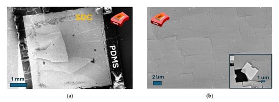 Figure 5b, single-crystal SDC flakes with a distinctive square shape are observed. The square morphology reflects the cubic symmetry of the SDC crystal structure, highlighting its well-preserved crystallographic features. This observation suggests that, despite the presence of cracks, the crystalline quality of the SDC layer remains largely unaffected by the transfer process. The retention of these structural characteristics shows the effectiveness of the growth and transfer protocols in maintaining the film’s intrinsic properties, which is essential for its performance in applications such as ionic conductors, solid oxide fuel cells, or thin-film-based electronic devices. To further enhance the quality of the transferred membranes, improvements in the transfer process could focus on minimizing cracking. Such optimization would enable the production of high-quality, flexible membranes tailored for advanced technological applications. The sacrificial layer method gives the possibility to evaluate the transport properties of the materials in a free-standing configuration without any interfacial contribution due to the presence of the substrate and or the bottom layer in a heterostructure configuration.