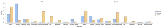 The results by sex indicate that smashes, off-court shots and recovery smashes are more frequently winning shots in men than in women. Conversely, volleys, bandejas, víboras, off-the-wall shots and forehand and backhand shots are more frequently winning shots in women than in men. These results are in line with previous studies that analyze the differences in performance between male and female professional padel according to the type of shots [15,47]. Furthermore, other research indicates that men generally hit more shots close to the net, while women hit more shots from the middle and back of the court [15,48,49]. Therefore, men develop a more aggressive game (performing smash, recovery smash…), while women develop a less aggressive game (performing volleys, bandejas…), perhaps due to the anthropometric and strength differences between male and female elite players [50,51]. In addition, previous studies reported that male players are taller, with higher muscle percentages and higher levels of vertical jump and grip strength [50,51,52], allowing them to finish the points with more powerful smashes than female padel players. Finally, a recent study also found that women make more winners than men from the baseline, with shots such as the forehand, backhand and bandeja [21]. Therefore, it is recommended to adjust the way of training according to the athletes’ sex.