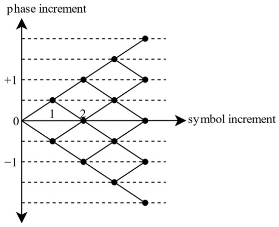 By leveraging signal phase symmetry, the proposed algorithm can further optimize the number of local reference signals without any performance loss. In Figure 2, it can be seen that the top half of the matching branches is different from the bottom half in phase, and this is because the middle bits take different values with 0 and 1. Figure 4 shows the phase tree of the PCM/FM signals, where the horizontal axis represents the increment in the number of symbols, and the vertical axis represents the phase increment. It is evident that the stored local reference signals exhibit the characteristic of phase symmetry. Specifically, among all local reference signals, the code groups {a0, a1, a2, 0, a4, a5, a6} and {a0, a1, a2, 1, a4, a5, a6} are symmetric, where {a0, a1, a2, a4, a5, a6} represents any possible combination of symbols. According to Equation (5), in their corresponding complex forms, these two code groups are complex conjugates of each other. This can be described as follows.