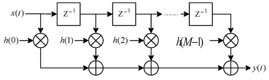 The FIR filter consists of three components: adders, multipliers, and delay blocks [19,20]. Figure 5 shows a typical structure of a single-channel and single-coefficient FIR filter. Here, h(i) represents the filter coefficients. According to Equations (12)–(14), during the correlation operation, the real and imaginary parts are computed separately. Therefore, the value represented by h(i) is the quantized value of either the real or imaginary part, and the value of h(i) is equivalent to the discrete form of in Equation (11). Z−1 is the delay unit, M is the filter order, x(t) is the input data, and y(t) is the output data.
