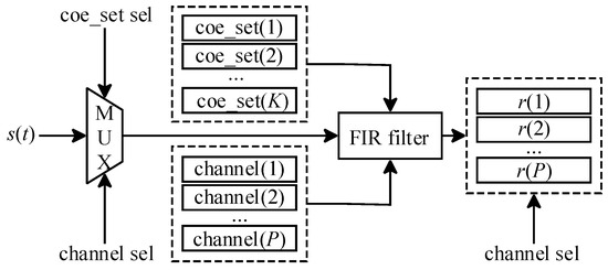 In Figure 6, r(p) represents the output data of the p-th channel; P is the total number of channels; and K is the total number of coefficients. The coefficient selection module (coe_set sel) and the channel selection module (channel sel) jointly process the sampled data of the signal, corresponding to the matching relationship between the channels and coefficients. Additionally, since the sampled data of multiple input channels share the same FIR filter sampling data, a time-division multiplexing mechanism is applied to transmit the single-channel input data. This approach increases the filter frequency while performing interleaved input processing of the input signals. The structure is shown in Figure 7.