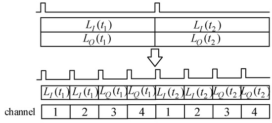 2. Multi-Channel Multi-Coefficient Processing: The local reference signal data are read from the ROM table using 16 consecutive addresses, and then these data are loaded as new coefficients into the corresponding FIR filters. The real and imaginary parts of each group are respectively used as coefficient set (1) and coefficient set (2). Additionally, as shown in Figure 7, time-division multiplexing is applied to the I and Q branches of the input data (received signal), which increases the sampling rate of the FIR filter input data. The I and Q branches are alternately read, transforming the original single-channel data stream into a four-channel data stream. Through multi-channel multi-coefficient processing, we obtain the input data of FIR filters in Figure 8 in different channels and different time slots.