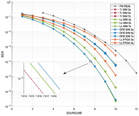 The ratio of bit energy to power spectral density was tested in the range of 1 dB to 10 dB. The three-symbol, five-symbol, and seven-symbol traditional MSD algorithms [23] (referred to as the Tr-MSD in this paper); the improved MSD algorithm proposed in reference [16], namely, the decision feedback MSD algorithm (referred to as the DFB-MSD in this paper); and the improved MSD algorithm proposed in this paper (referred to as the Lc-MSD in this paper) were evaluated through simulation experiments. The simulation and hardware measurement results are shown in Figure 9.