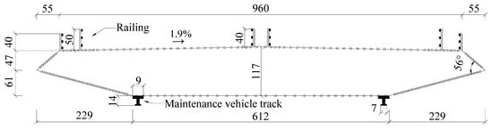 A streamlined box girder from a certain cable-stayed bridge was selected as the research object. The main beam has a width of 34.0 m, a height of 3.5 m, and a wind nozzle angle of 56°. Considering the wind tunnel test section dimensions and blockage ratio requirements, the scale ratio was set to 1:30. The scaled model has a length of 2.140 m, a width of 1.070 m, and a height of 0.117 m, with a width-to-length ratio of 2:1 and a width-to-height ratio of 9.15:1. The maximum blockage ratio is less than 4.48%. The sectional model parameters are shown in Table 1. The model is constructed with a steel tube and rib plates as the framework and covered with ABS panels to ensure sufficient strength and stiffness.