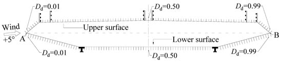 where di is the distance from the i-th pressure measurement point on the upper or lower surface to point A along the surface and D is the distance along the surface on which the i-th point is located between points A and B, with both di and D measured in meters. Points A and B are the end points on both sides of the main beam section. Figure 2 shows the dimensionless distance diagram for the sectional model of the main beam.