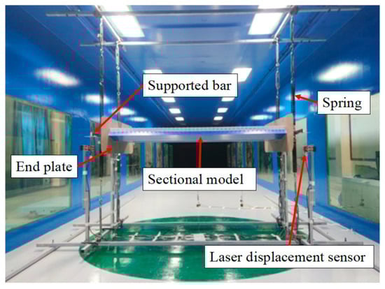 The model is supported by eight vertical springs. The influence of the end plate on the flow pattern and the aerodynamic characteristics of the test models are complicated. Many researchers have carried out numerous experimental and numerical studies. Many valuable conclusions were obtained [41,42,43,44]. Generally, the end plate can suppress the end effect. The suppression effect is dependent on the shape and dimension of the end plate. The end plates used in wind tunnel tests for a streamlined beam section model were usually rectangular plates with round corners. The width of rectangular plates was around 1.4–5.5 times the beam width, and the height was around 3–5 times the beam height [1,3,36,44]. Thus, the rounded rectangular end plates with a width of 1.5B and a height of 3.5H were employed to eliminate the end effects in the current study. The wind speed was measured using the Series 100 Cobra Probe (Turbulent Flow Instrumentation Pty Ltd., Tallangatta, VIC, Australia), with a measurement range of 2–100 m/s, a sampling frequency of 625 Hz, and a measurement accuracy of ±0.5 m/s. The vibration displacement was measured using the HL-G112-A-C5 laser displacement sensor (Panasonic Holdings Corporation, Kadoma, Japan), with a distance of 120 mm between the laser emission point and the measurement center, a measurement range of 120 ± 60 mm, a sampling frequency of 1000 Hz, and a resolution of 8 μm. The installation diagram of the model is shown in Figure 3.