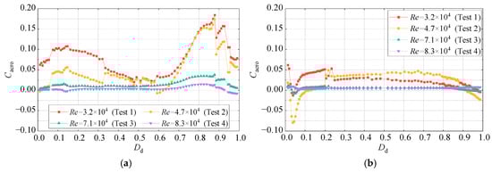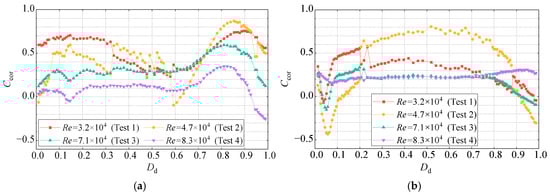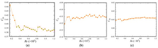 As shown in Figure 4a, the drag coefficient has an obvious Reynolds number effect. In the Reynolds number range of 1.6 × 104 < Re < 4.3 × 104, the drag coefficient decreases significantly upon increasing the Reynolds number. At Re = 1.6 × 104, it is around 0.44, and at Re = 4.3 × 104, it is around 0.38, which is a reduction of 0.06 or approximately 14%. In the range of 4.3 × 104 < Re < 1.2 × 105, the drag coefficient remains relatively stable upon increasing the Reynolds number, maintaining a value between 0.38 and 0.39. The change law of the drag coefficient is the same as that obtained by other scholars, with only minor numerical differences [9,12,19,23], which indicates that this study is credible.