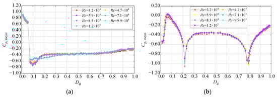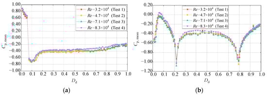 In the Reynolds number range of 3.2 × 104 < Re < 8.3 × 104, no Reynolds number effect is observed on the mean values of the wind pressure coefficients. However, as the Reynolds number increases from 8.3 × 104 to 9.9 × 104, the distributions of the Cp,mean change in the region of Dd = 0.07–0.33 from large fluctuations to a more gradual pattern. This indicates a slight Reynolds number effect on the mean values when the Reynolds number exceeds 8.3 × 104. For example, at Dd = 0.10, the Cp,mean values at Re = 9.9 × 104 and Re = 1.2 × 105 are −0.56 and −0.55, respectively, whereas at other Reynolds numbers, the Cp,mean values range from −0.66 to −0.74, changing by 0.11 to 0.19 or approximately 17% to 26%.