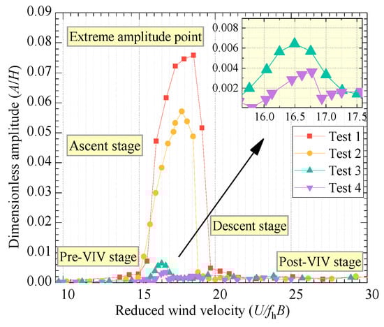 In the four tests with different spring stiffnesses corresponding to four different Reynolds numbers, the variation in the dimensionless VIV amplitude with the dimensionless wind speed is shown in Figure 7. Here, the dimensionless amplitude is defined as A/H, where A is the vertical displacement of the main beam and H is the height of the main beam. The dimensionless wind speed is defined as U/fhB, where fh is the vertical natural frequency and B is the width of the main beam.