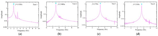 Figure 8 shows that the vibration amplitude spectra exhibit distinct dominant frequencies of 1.93 Hz, 2.98 Hz, 4.57 Hz, and 5.31 Hz, which are close to or equal to the corresponding system’s vertical natural frequencies. The spectra display typical narrowband characteristics, confirming that vertical VIV occurred in the four test cases [45,46,47].