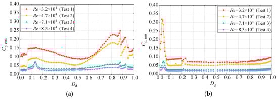 As shown in Figure 6a, the distribution curves of the RMS values on the upper surface at different Reynolds numbers are similar in shape. At Dd = 0.13, 0.87, and 0.92, Cp,rms reaches its maximum value, indicating that the turbulence induced by the railing enhances the pressure fluctuations. There are differences in the Cp,rms values at different Reynolds numbers. Except for the region where Dd = 0.10–0.17, the Cp,rms decreases with increasing Reynolds number. In the region where Dd = 0.10–0.17, Cp,rms decreases, increases, and then decreases again with increasing Reynolds numbers. The variation amplitude of Cp,rms differs across Reynolds number ranges. For 3.2 × 104 < Re < 5.9 × 104, the variation amplitude is large, reaching 60%, whereas for 5.9 × 104 < Re < 1.2 × 105, the fluctuation amplitude is smaller.