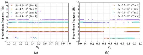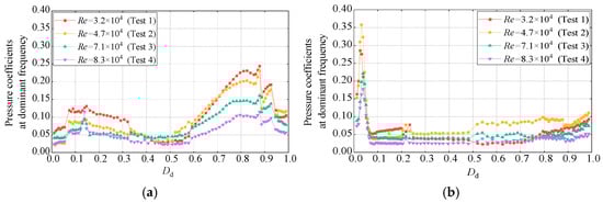 As shown in Figure 11a, when Re = 3.2 × 104 and 4.7 × 104, the dominant frequencies of the fluctuating pressure at all of the measurement points are nearly the same, matching the vertical VIV frequencies of 1.90 Hz and 2.97 Hz, respectively. However, when Re = 7.1 × 104 and 8.3 × 104, the dominant frequencies at the measurement points differ. At these two Reynolds numbers, the dominant frequencies at most measurement points are 4.53 Hz and 5.27 Hz, respectively, which are consistent with the vibration frequencies observed in the VIV tests of the corresponding Reynolds numbers. However, the dominant frequencies at the measurement points in the upper surface regions of Dd = 0.12–0.15 and Dd = 0.35–0.55 deviate from the VIV frequencies.