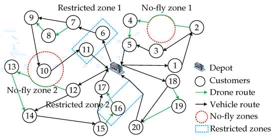 Schematic diagram of TDVRPD-VRZ-NFZ. Numbers 1 to 20 represent the customer IDs.