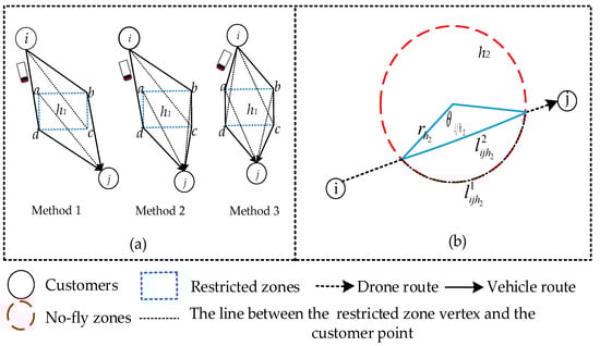 As shown in Figure 2b, the drone follows a detour along the edge of the no-fly zone, with a central angle of . The flight length along the edge of the no-fly zone is , and the distance flown within the no-fly zone without detouring is . The additional detour distance is . The total flight distance between the customer points for the drone is expressed by Equations (1) and (2) [].